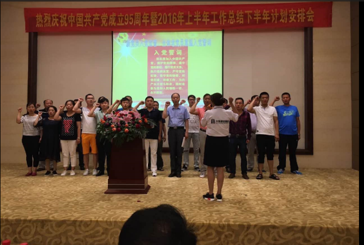 隨著一曲大合唱《沒有共產(chǎn)黨就沒有新中國(guó)》,拉開了會(huì)議的序幕。在中國(guó)共產(chǎn)黨95周年華誕之際,熱烈祝賀我們黨永葆青春!我們的國(guó)家繁榮昌盛!公司黨委組織了新黨員宣誓,重溫了入黨誓詞,充分表達(dá)了對(duì)我黨的熱愛之情。