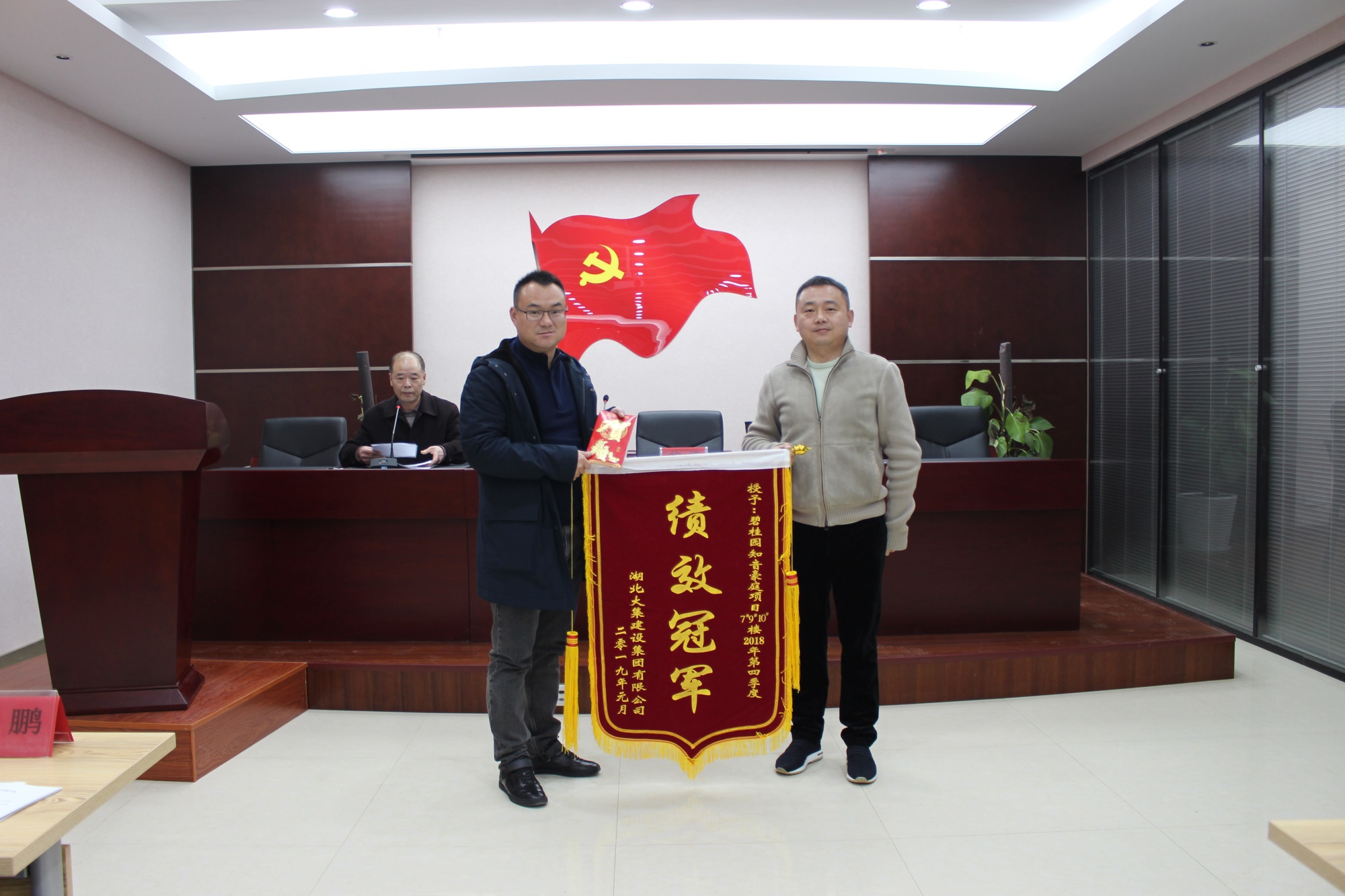 會(huì)議開始,集團(tuán)董事長(zhǎng)徐濤為2018年第四季度項(xiàng)目績(jī)效冠軍——碧桂園知音豪庭7、9、10#頒發(fā)錦旗和獎(jiǎng)金。