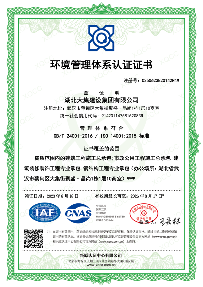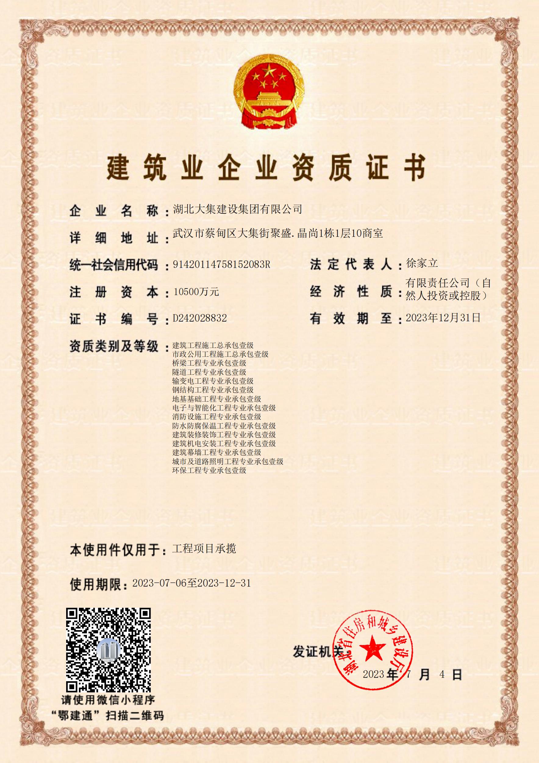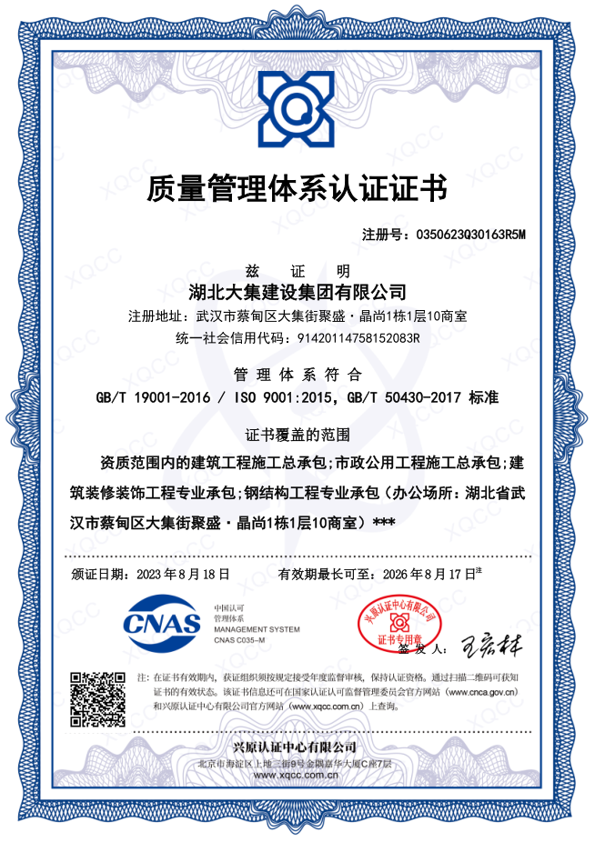 湖北大集建設(shè)集團(tuán)有限公司成立于1990年,注冊(cè)資本10500萬(wàn)元,是武漢市蔡甸區(qū)本土建筑行業(yè)的龍頭企業(yè),在行業(yè)內(nèi)具有一定的品牌影響力。擁有建筑工程施工總承包一級(jí)、市政公用工程施工總承包一級(jí)、橋梁工程專業(yè)承包一級(jí)、隧道工程專業(yè)承包一級(jí)、輸變電工程專業(yè)承包一級(jí)、鋼結(jié)構(gòu)工程專業(yè)承包一級(jí)、地基基礎(chǔ)工程專業(yè)承包一級(jí)、電子與智能化工程專業(yè)承包一級(jí)、建筑裝修裝飾工程專業(yè)承包一級(jí)等多項(xiàng)資質(zhì)。現(xiàn)已形成“建筑施工、園林綠化、文化旅游、房地產(chǎn)開發(fā)與物業(yè)管理”四大產(chǎn)業(yè)格局,并通過了行業(yè)和國(guó)家質(zhì)量管理體系、環(huán)境管理體系和職業(yè)健康安全管理體系認(rèn)證,三大安全管理體系日臻完善,是一家綜合力較強(qiáng)的綜合性建筑施工企業(yè)。