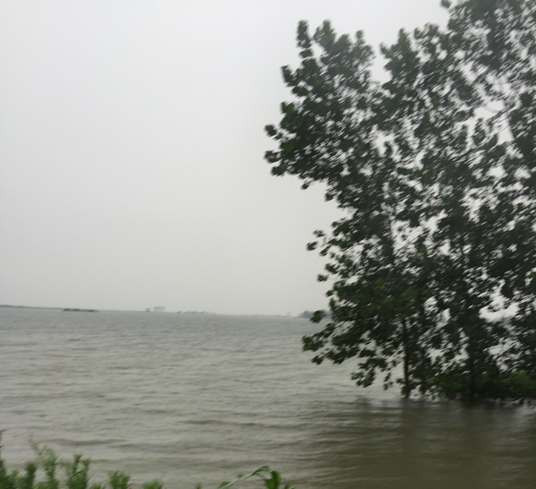 車子行駛在大堤上,隨處可見紅旗招展,黨旗迎風(fēng)飄揚,隔段就有帳篷拉起來的簡陋住所。這里的田疇已經(jīng)完全泡在水里,稻谷和高梁果樹已浸泡得不成樣子。大堤上雖然不知道有多少人筑守在這里,一路行駛中到處可以看到分村分段守護的標(biāo)牌矗立著。