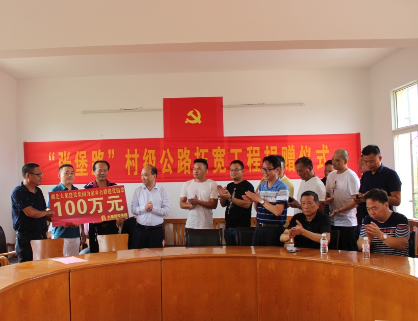 情系家鄉(xiāng)發(fā)展,勇?lián)鐣熑巍?月26日,集團董事長徐濤、總經(jīng)理徐遠征、副總經(jīng)理徐家富及各項目經(jīng)理來到蔡甸區(qū)大集街堡家咀村村委會,為“張堡路”村級公路拓寬工程進行捐贈,集團董事長徐濤代表湖北大集建設集團為該工程捐款一百萬元。