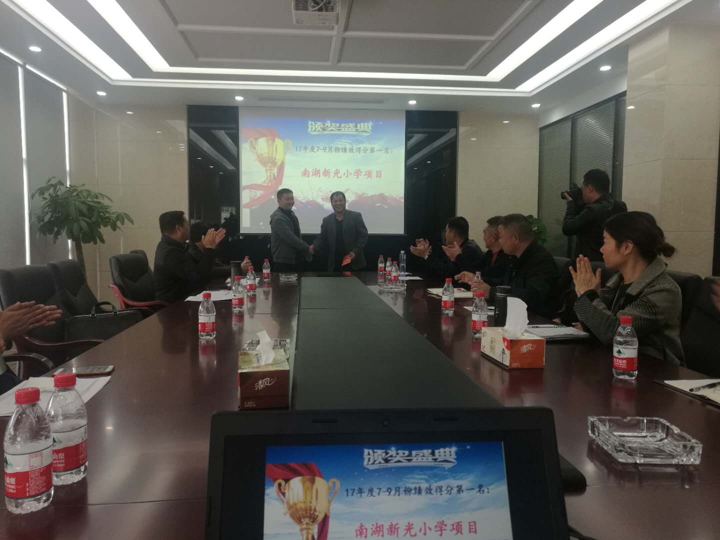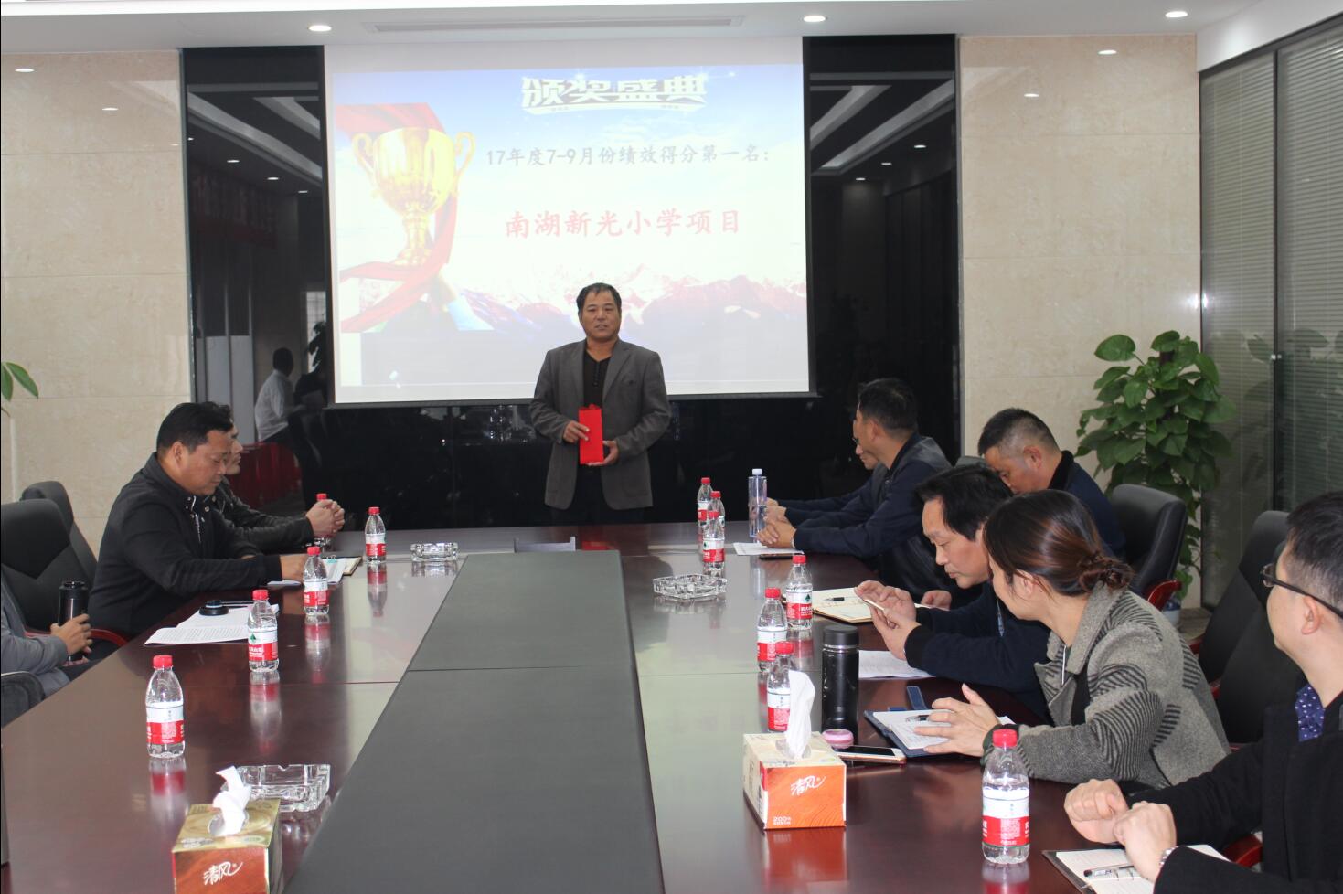 會(huì)議開始,由人事行政部公布了上季度績效考評(píng)中的冠軍項(xiàng)目——南湖(新光)小學(xué)項(xiàng)目,并由董事長徐濤向冠軍項(xiàng)目頒發(fā)10000元獎(jiǎng)金!