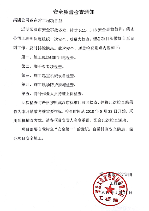 為進(jìn)一步貫徹落實(shí)集團(tuán)公司“安全生產(chǎn)重于泰山”的管理理念,5月21日,工程部下發(fā)質(zhì)量安全檢查通知,并成立質(zhì)量安全檢查組,自5月22日起隨機(jī)對(duì)集團(tuán)在建項(xiàng)目施工現(xiàn)場(chǎng)進(jìn)行安全檢查,嚴(yán)密排查施工現(xiàn)場(chǎng)的安全隱患,確保各項(xiàng)目安全施工工作順利開(kāi)展。