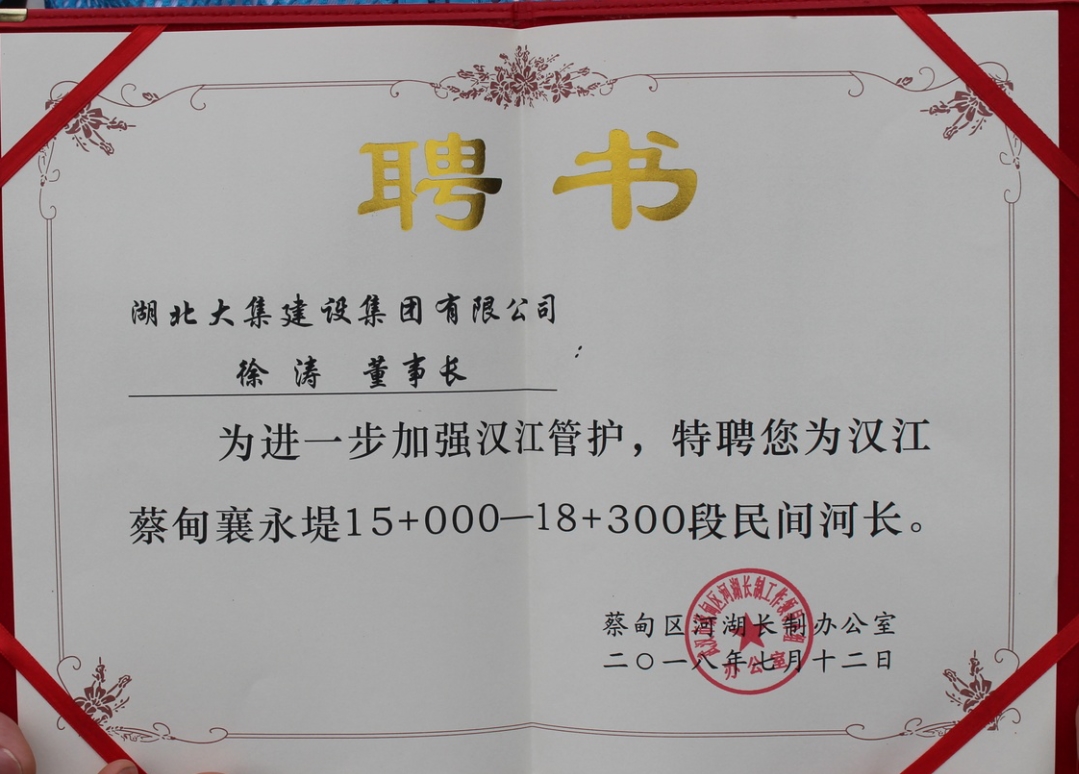 水是生命之源、生產(chǎn)之要、生態(tài)之基。為貫徹落實(shí)習(xí)近平總書記視察湖北的重要講話精神,進(jìn)一步加強(qiáng)河湖管理和保護(hù)工作,7月12日,蔡甸區(qū)漢江民間(企業(yè))河長履職啟動儀式于蔡甸區(qū)江灘公園隆重舉行,湖北大集建設(shè)集團(tuán)董事長徐濤受聘為漢江蔡甸襄永堤15+000—18+300段民間河長。