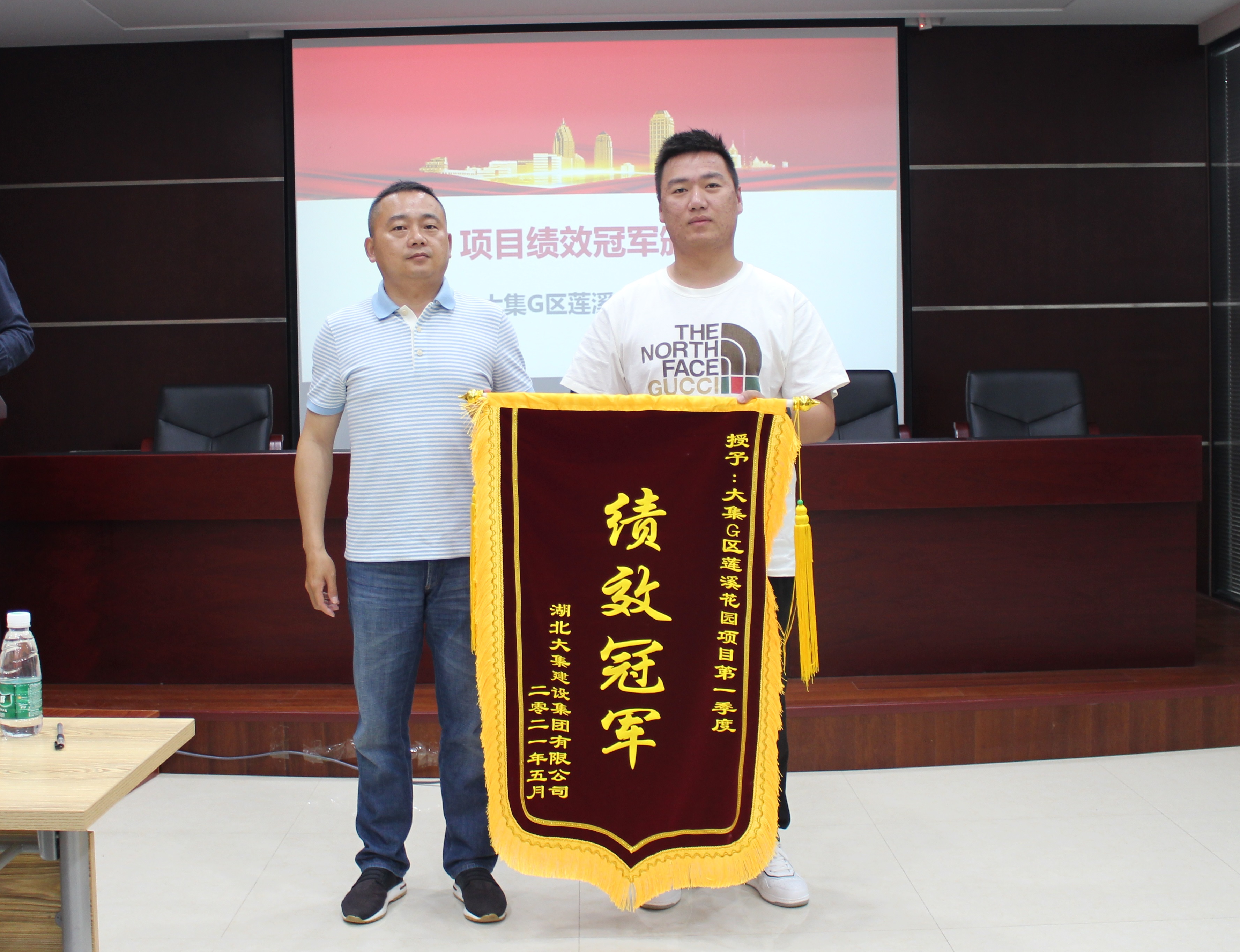 隨后,行政部部長李漢毛公布項目第一季度績效考核排名,并由集團公司董事長徐濤為第一季度項目績效冠軍——大集G區(qū)蓮溪花園項目頒發(fā)錦旗及獎金。