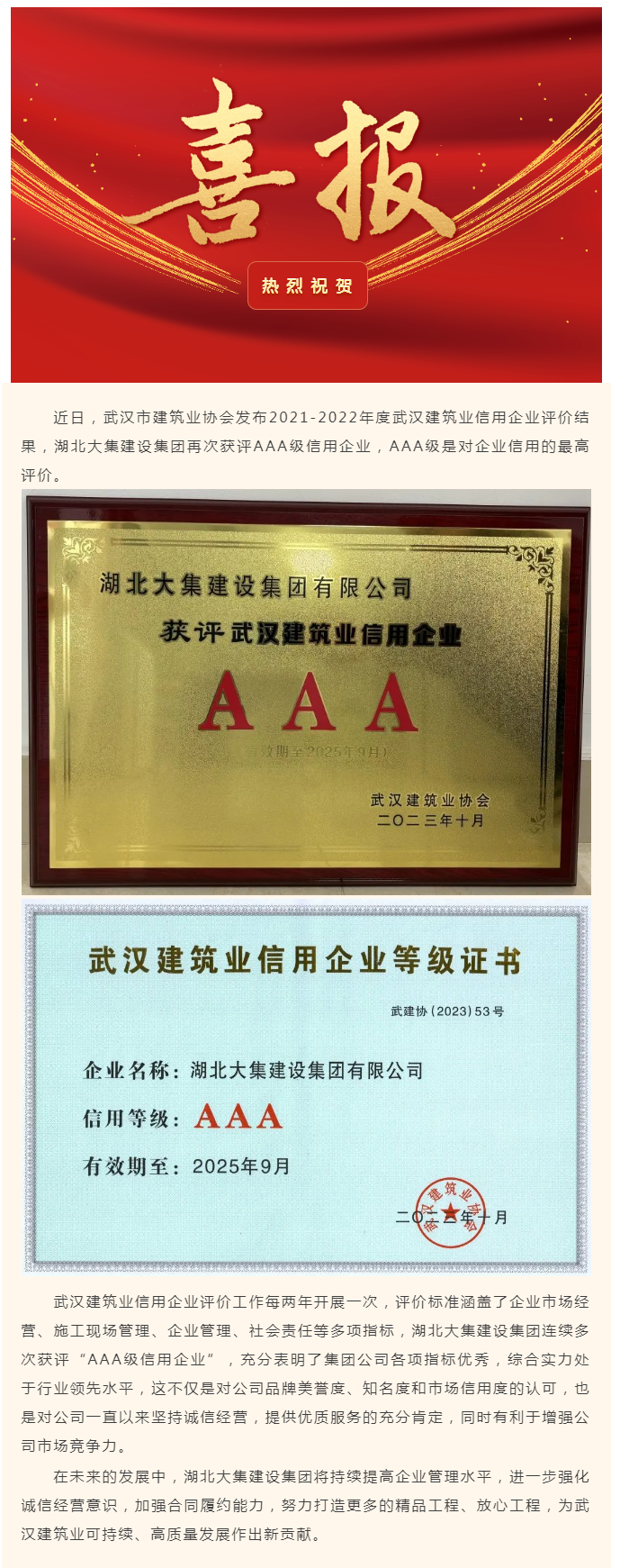 喜報!湖北大集建設(shè)集團再次獲評“武漢建筑業(yè)AAA信用企業(yè)”
