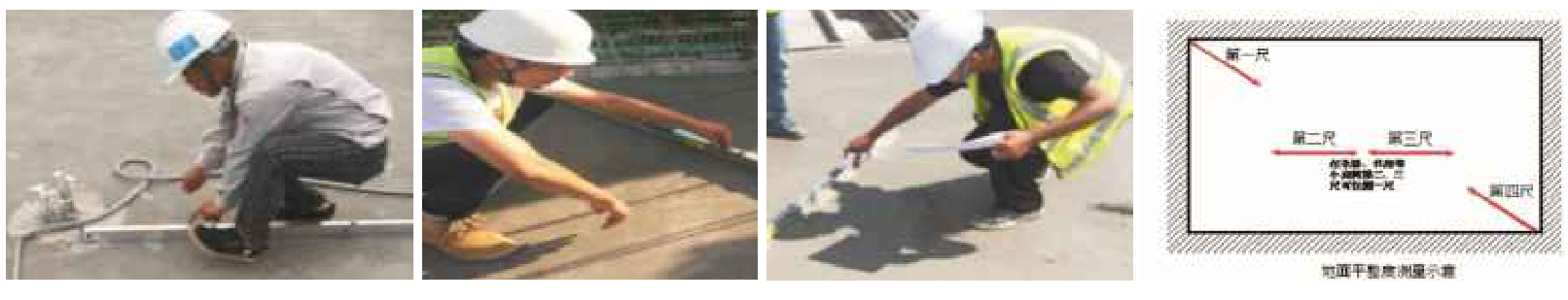 2.任選同一功能房間地面的2個對角區(qū)域,按與墻面夾角45度平方靠尺測量2次,加上房間中部區(qū)域測量一次,共測量3次???餐廳或較大房間地面的中部區(qū)域需加測1次;