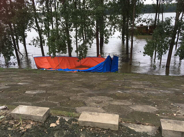 7月4日凌晨,因遭夜風(fēng)暴襲擊,我街值守點帳篷出現(xiàn)部分垮蹋,大集建設(shè)集團組織工作人員帶上設(shè)備、材料奔赴漢江干堤防汛前線,為值守點重新搭建帳篷。