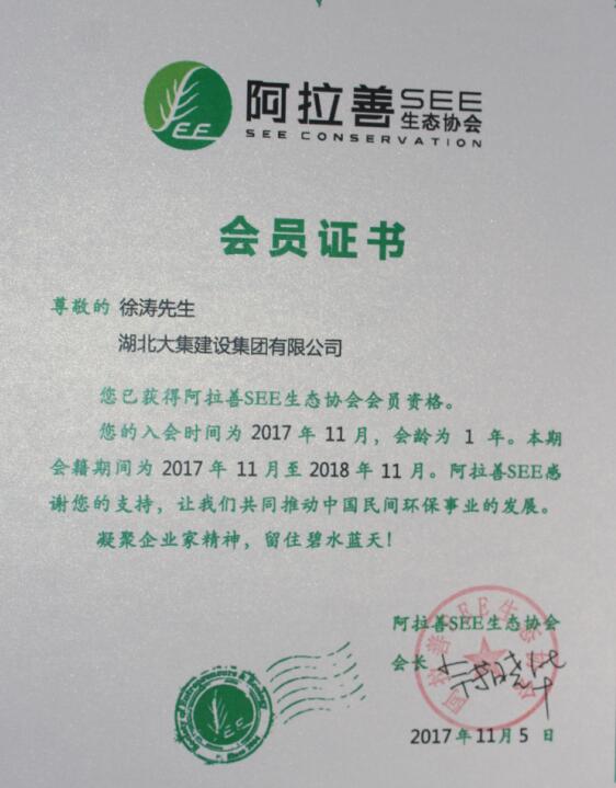 2017年11月,集團董事長徐濤攜湖北大集建設集團加入阿拉善SEE生態(tài)協(xié)會,正式成為阿拉善SEE會員,與各界熱心環(huán)保的社會人士共同推動民間環(huán)保事業(yè)的發(fā)展,努力為阿拉善沙漠筑起最美的防護墻!