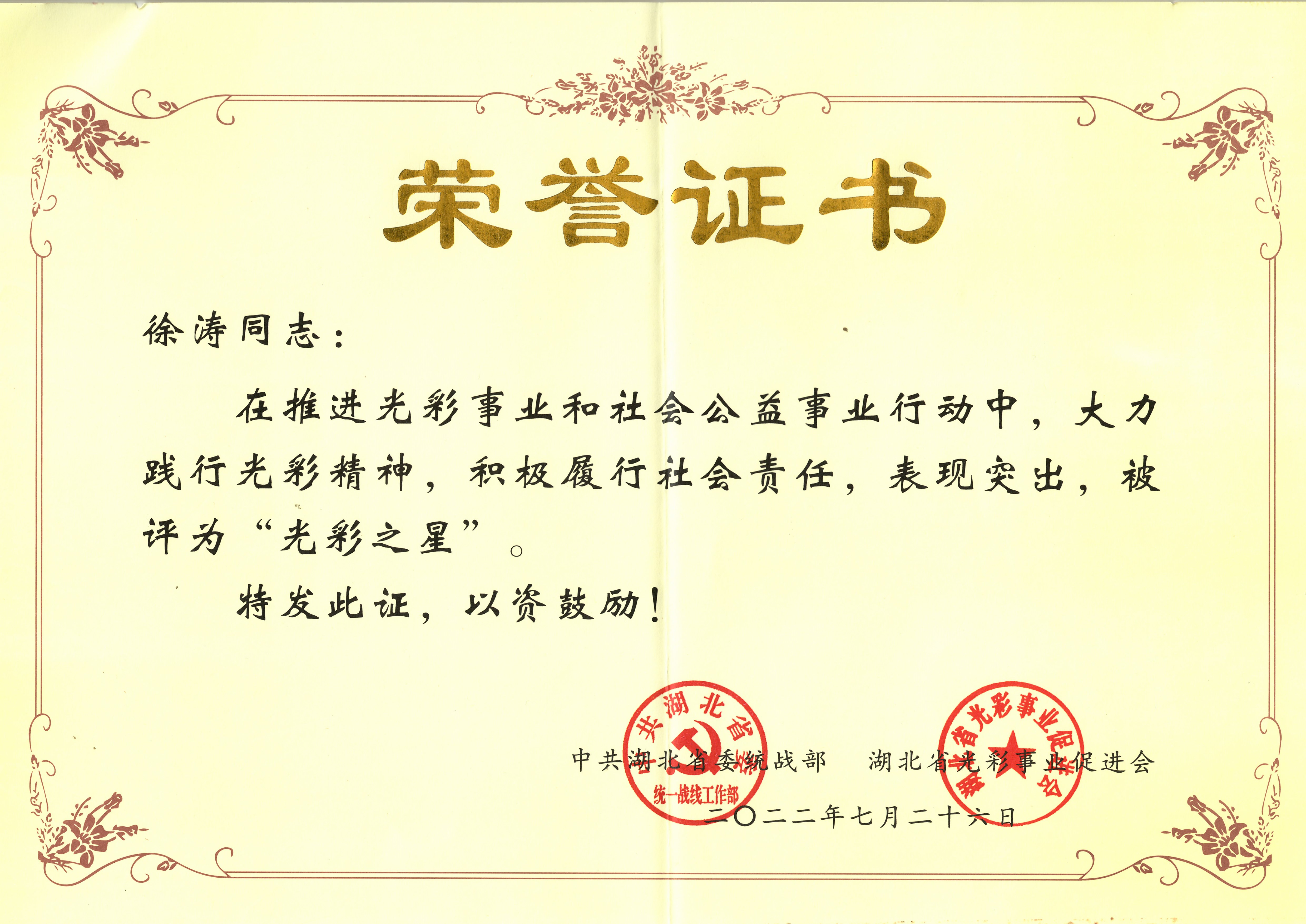 近日,由中共湖北省委統(tǒng)戰(zhàn)部、省光彩事業(yè)促進(jìn)會(huì)共同評(píng)選60名民營(yíng)經(jīng)濟(jì)人士“光彩之星”表彰會(huì)在恩施召開(kāi)。會(huì)議表彰了一批熱心公益事業(yè)、積極回報(bào)社會(huì)的優(yōu)秀非公有制經(jīng)濟(jì)人士,湖北大集建設(shè)集團(tuán)有限公司董事長(zhǎng)、武漢閱景匯投資發(fā)展有限公司董事長(zhǎng)徐濤榮獲全省“光彩之星”榮譽(yù)稱號(hào)!